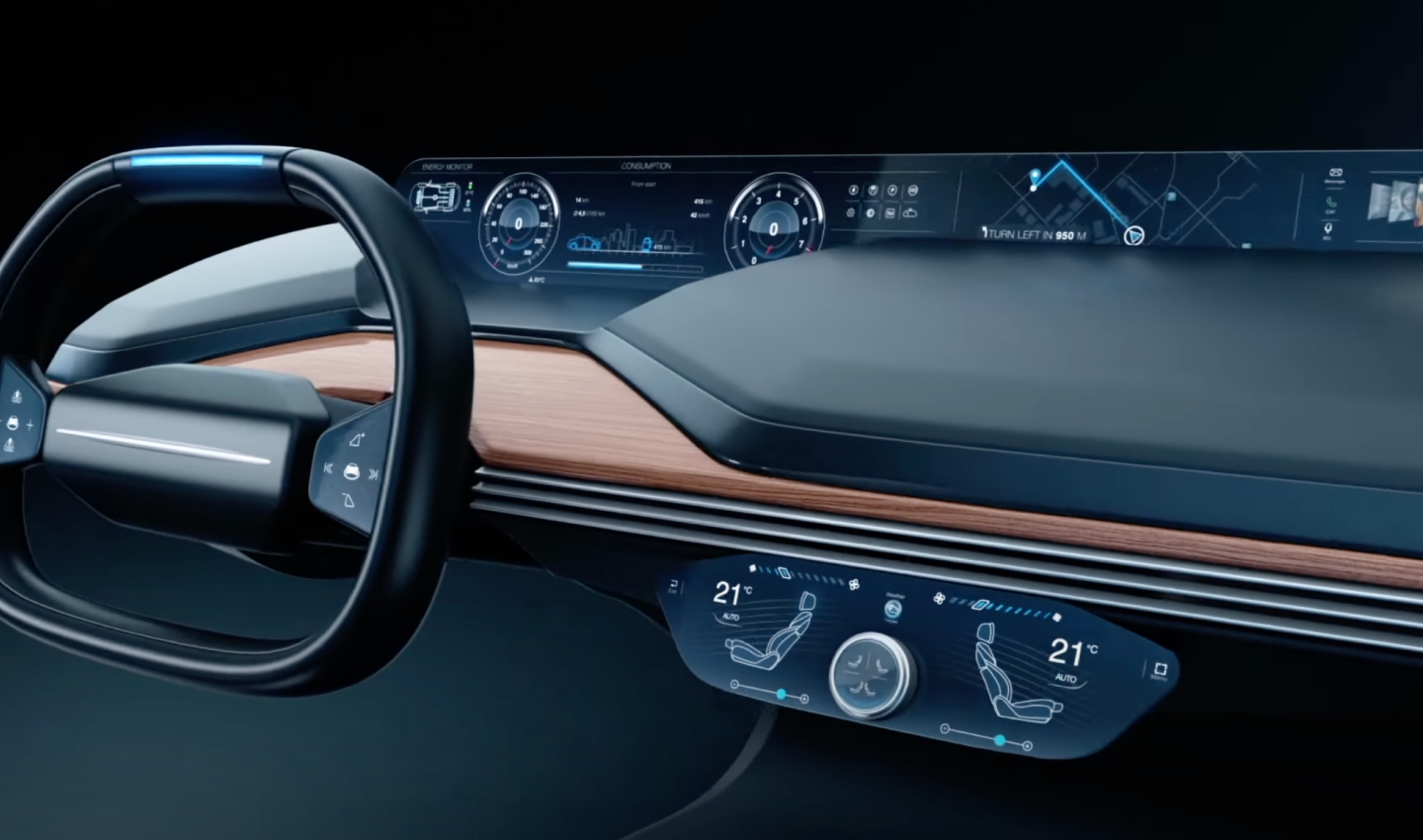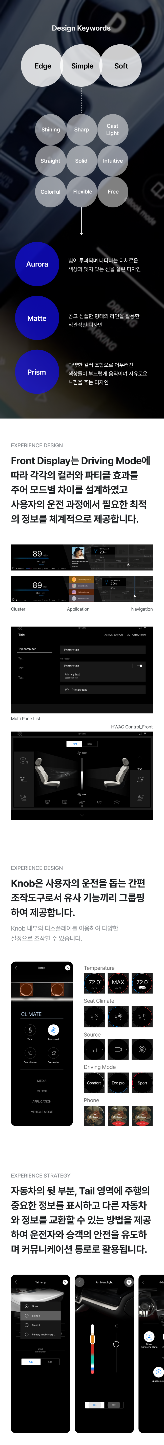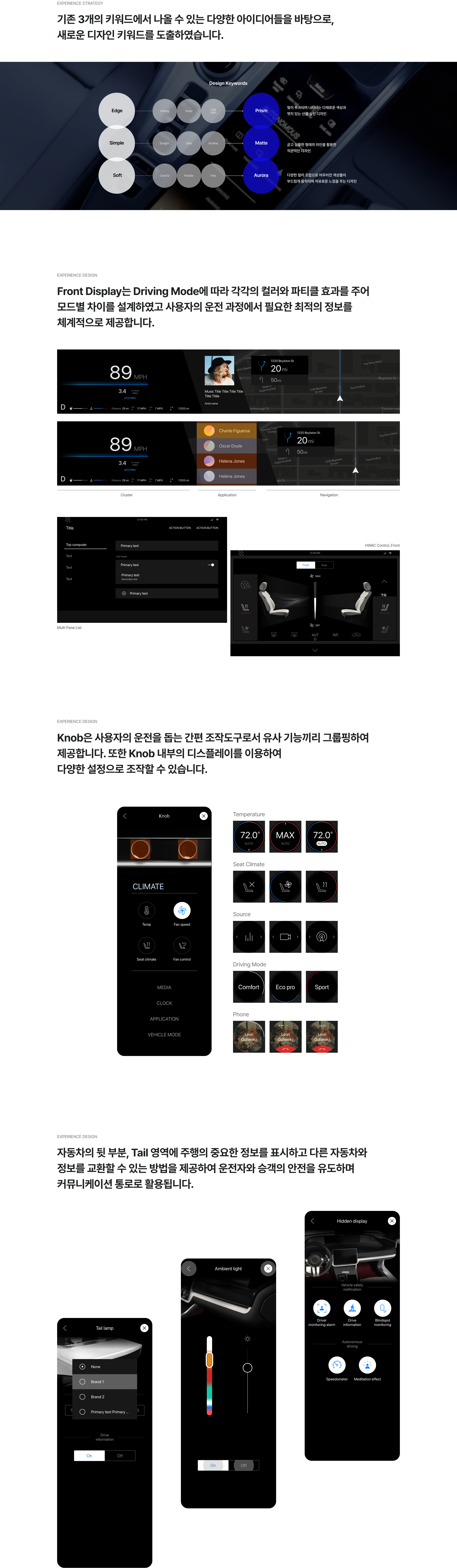 안전 운전을 위해 운전석 옆과 전면 유리 앞에 각각 디스플레이를 배치해 주행 정보를 제공하고, 운전석 중앙 디스플레이를 통해 인포테인먼트를 즐길 수 있습니다. Cockpit에 내장되는 Front Display, CID, Knob, Tail lamp 디스플레이에 제공할 다양한 화면들을 제작하였습니다.