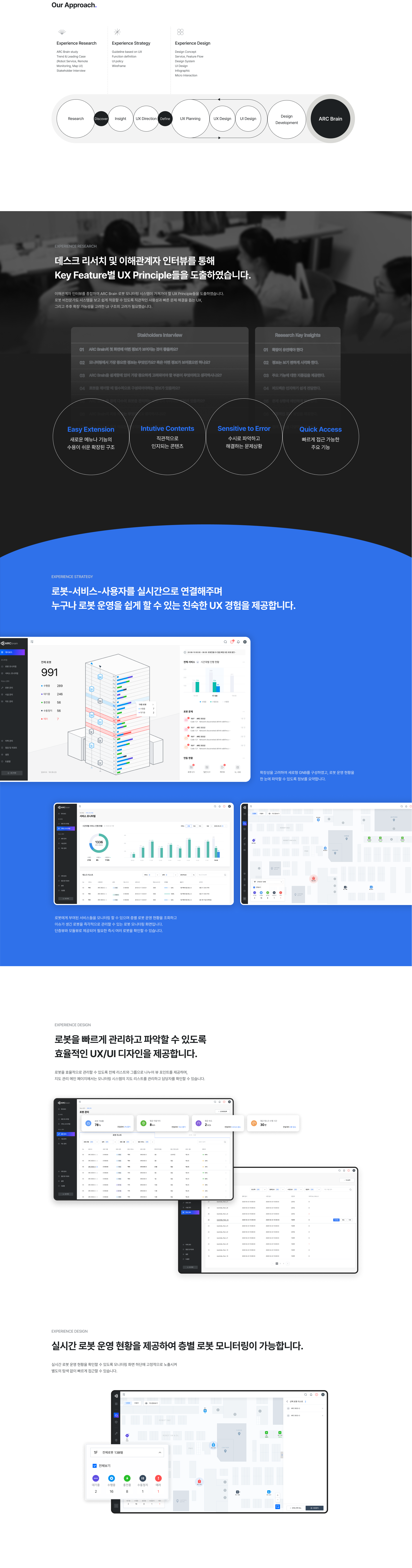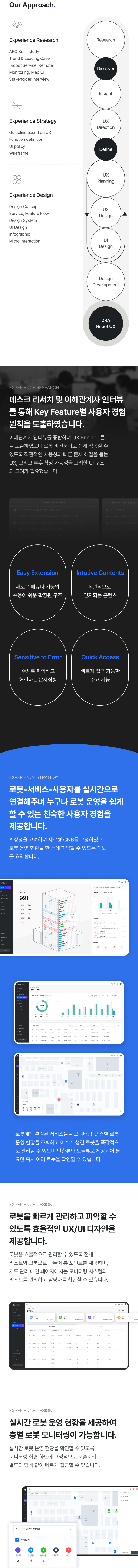 Robotics Service의 경쟁사 리서치와 내부 이해관계자 인터뷰를 진행하여, 운영 현황을 계속 확인해야 하는 사용자의 피로도를 줄여줄 수 있는 방법과 다수의 로봇을 안정적으로 관리하는 방법, 확장성을 고려한 UI 구축 솔루션을 도출하여 시각화 작업을 진행하였습니다.