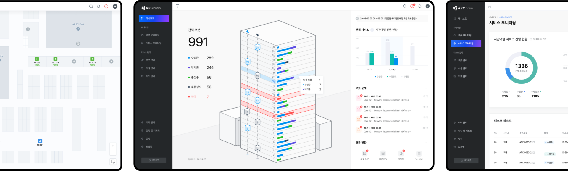 ARC Brain은 로봇-서비스-사용자를 실시간으로 연결해주는 허브 서비스입니다. 실시간 서비스 요청 사항과 로봇의 수행 현황 파악이 가능한 Monitoring UX/UI Design을 진행하였습니다.