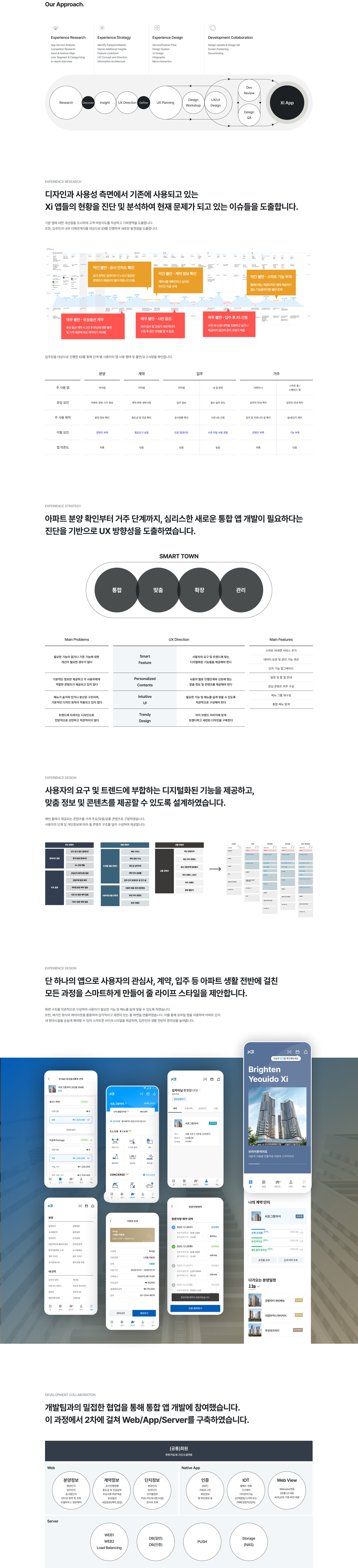 GS Xi 앱은 신축 아파트의 계약부터 완공 후 거주하면서 필요한 서비스까지, 모든 과정을 하나의 모바일 앱을 통해 제공하는 통합 서비스입니다. 계약 단계에서 고객이 비대면으로 계약서를 작성할 수 있도록 지원하고, 완공 후에는 내 집 상태 검수, 이사 예약은 물론, 입주자 간의 커뮤니케이션, 헬스장, 골프 연습장, 수영장 등의 커뮤니티 시설 이용 시에도 모바일 앱을 활용할 수 있도록 제작되었습니다.