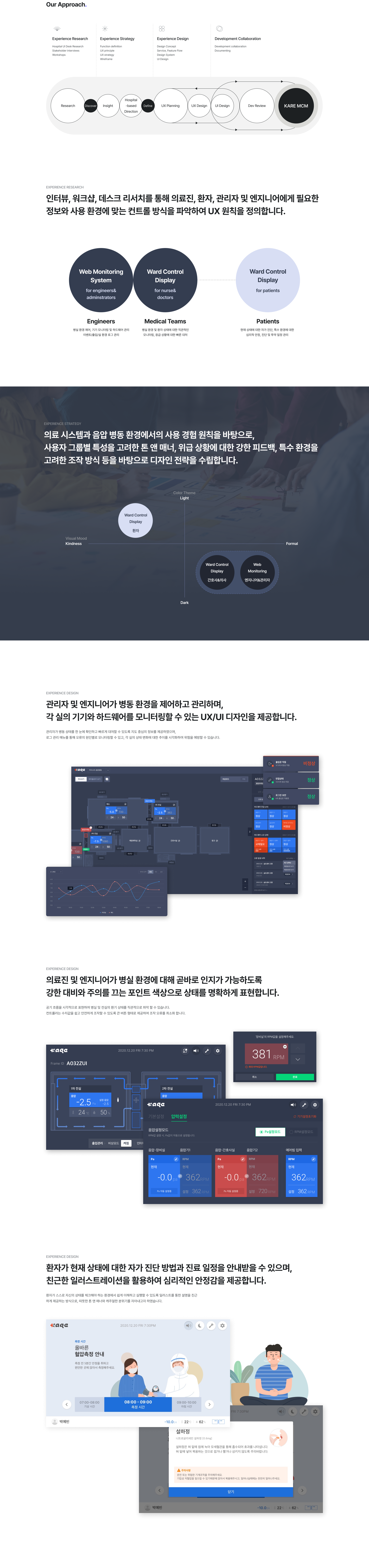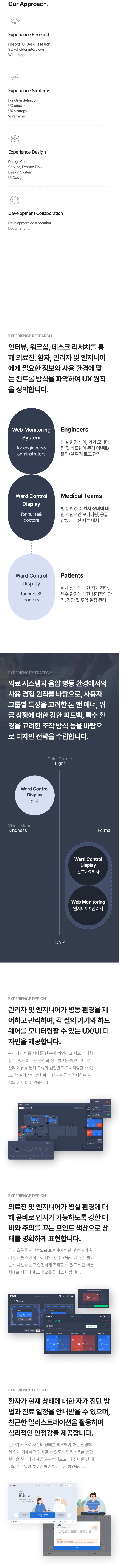 음압 병동을 이용하는 의료진과 인터뷰 및 워크샵을 진행하여 현황과 니즈를 파악하였습니다. 사용자 조사, 의료 시스템 주요 원칙, 음압 병동 환경에 적합한 원칙을 결합하여 UX 가이드라인을 설계하였습니다. 의료진, 환자, 관리자 및 엔지니어 등 사용자별로 디자인 컨셉 전략을 수립하여 음압 프레임에 부착된 컨트롤 디스플레이와 웹 기반 모니터링 시스템 UI를 디자인하였습니다.