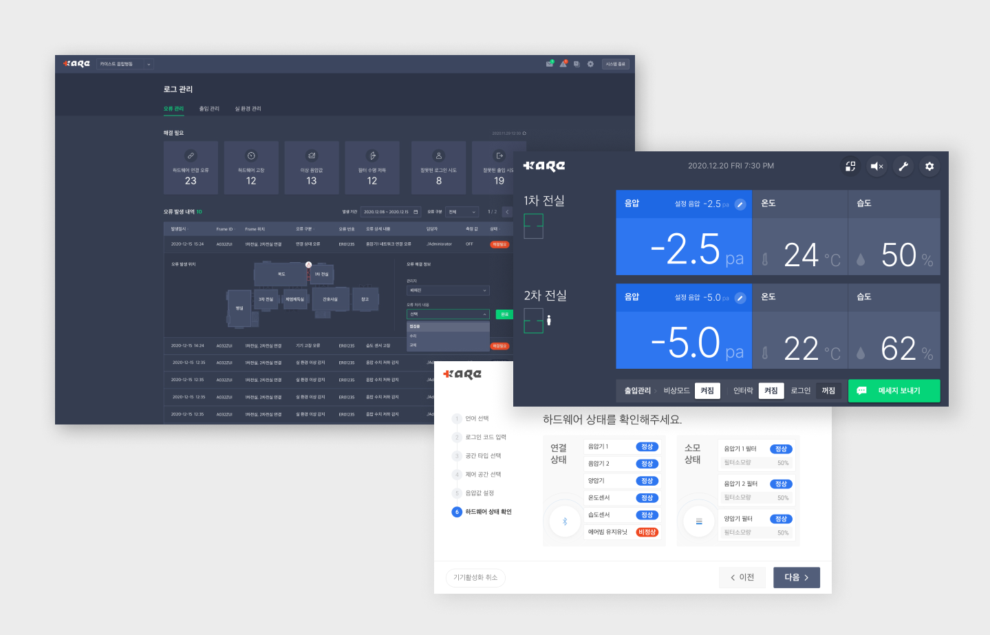 KARE MCM(Korea Aid for Mobile Negative Pressure Isolation Ward)은 COVID-19로 인한 음압 병상 부족 문제에서 고안된 이동식 모듈형 시스템으로 컨트롤, 모니터링 디스플레이 UI를 구축하였습니다.
