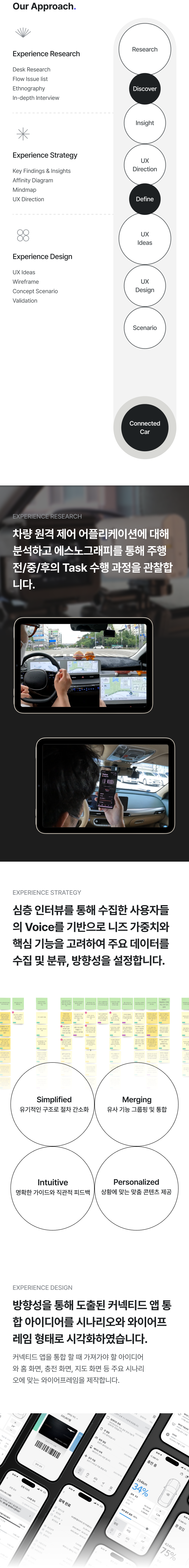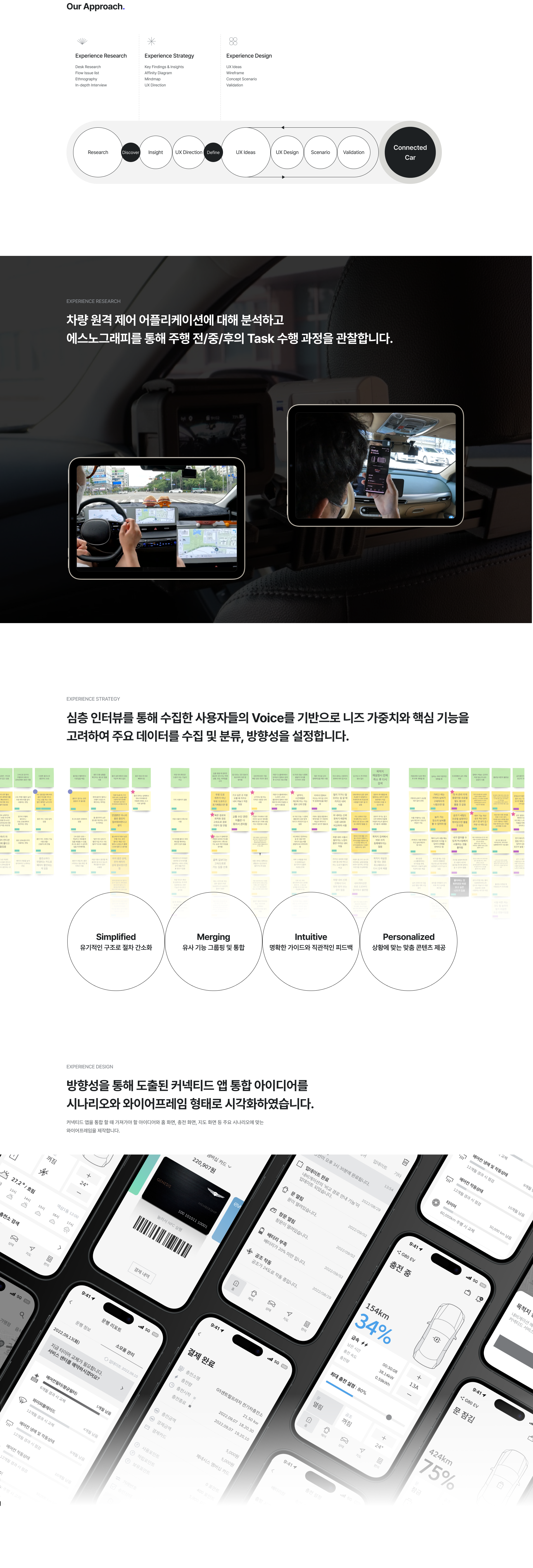 현재 커넥티드 앱과 경쟁사 조사 후 실제 사용자들의 주행 전/중/후 경험을 고프로로 촬영, 비디오 분석을 통해 발견한 특이점에 대해 상세한 인터뷰를 거쳐 Key findings & Insights를 도출하였습니다. 필수 니즈와 기회 영역을 종합하여 커넥티드 앱 사용자의 정보 안내 방식을 개선하고 새로운 기능에 대한 가이드라인과 와이어프레임을 제안하였습니다.