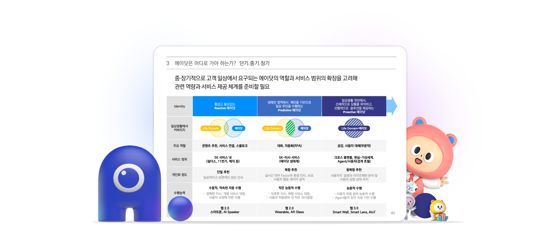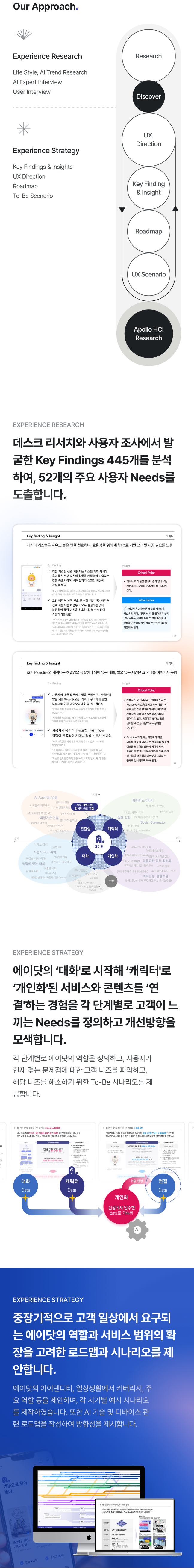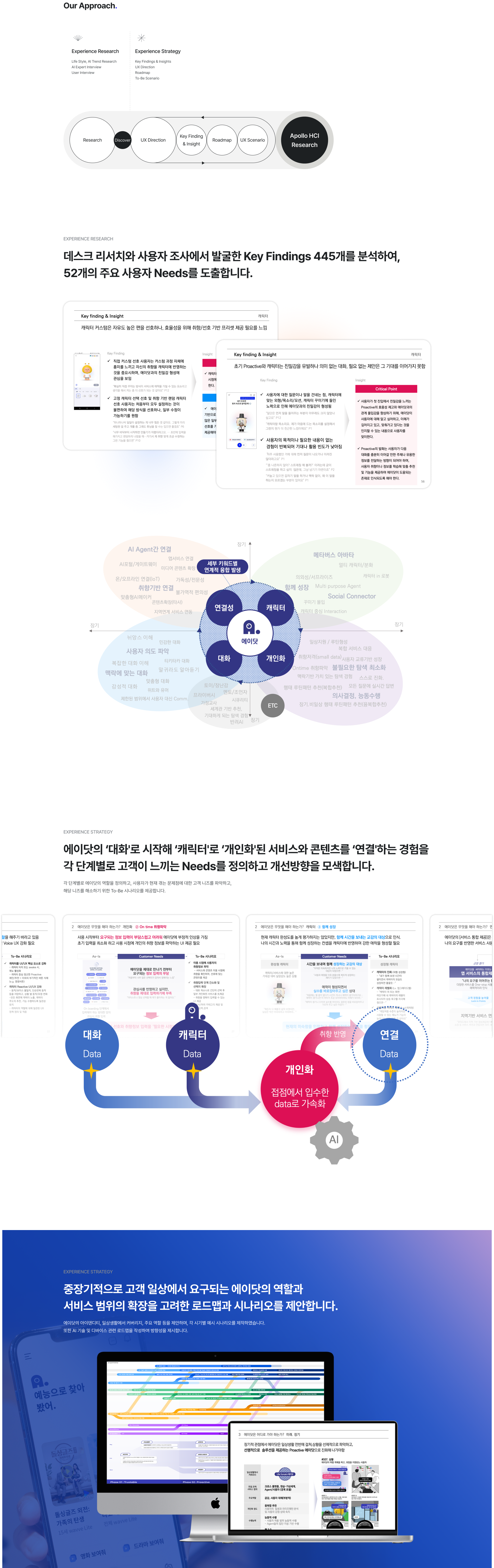 AI 트렌드, 선도 사업 등에 대한 데스크 리서치를 통해 AI Agent의 기회 영역을 발굴하고, AI 전문가와 AI/메타버스/NFT 얼리어답터 사용자 인터뷰를 통해 사용자의 명확한 니즈와 AI 미래 방향성을 예견합니다. 이후 수집한 니즈를 대화/캐릭터/개인화/연결이라는 카테고리에 따라 에이닷의 개선 방향을 제안합니다. 또한 추후 에이닷의 중장기적인 발전 방향을 설정하여 시나리오 형태로 도출하였습니다.
