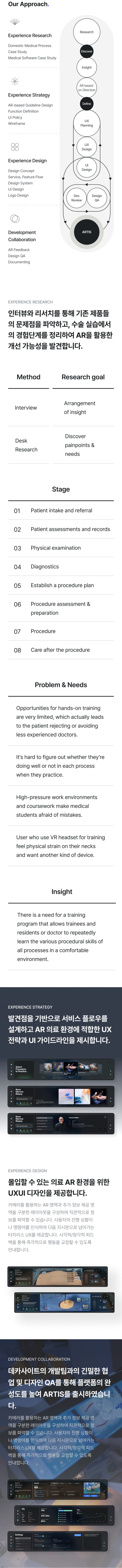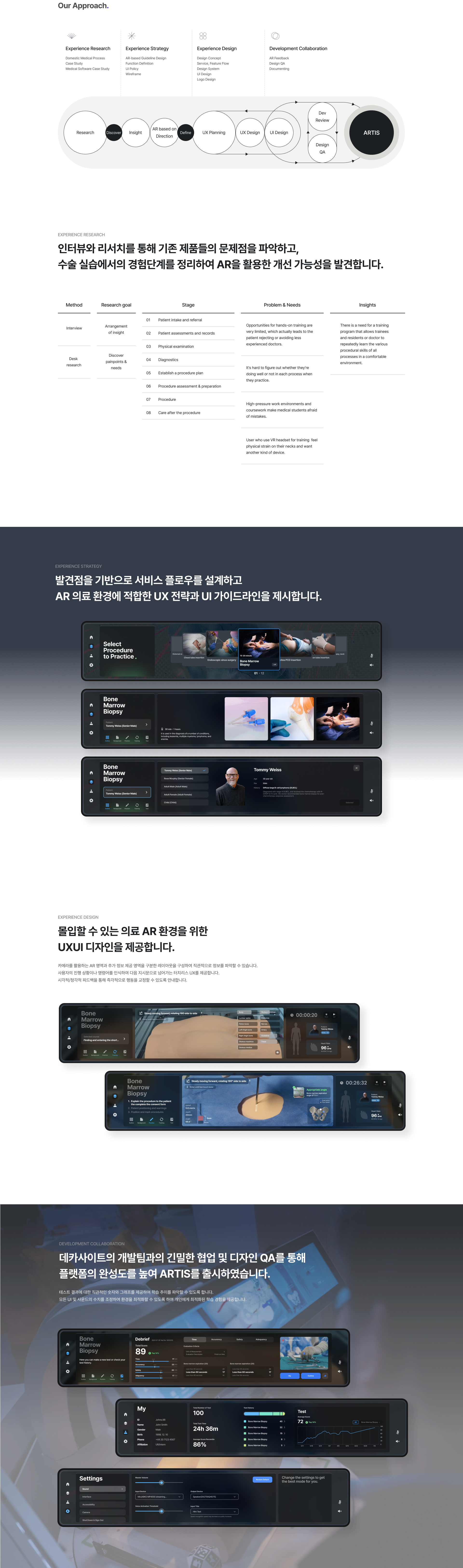 의료진이 경험하는 8가지 의료 프로세스를 조사 후, 시연할 골수 검사 과정에 대해 디테일한 데스크 리서치를 진행하여 학습 단계를 세분화하여 구성하고 AR 기반 가이드라인을 설계하였습니다. 이를 기반으로 실습 디바이스와 어우러질 수 있는 AR 네비게이션 인터페이스를 제안하였습니다.