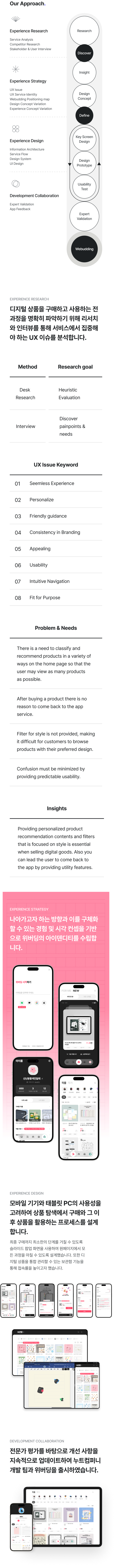 위버딩 플랫폼의 이해관계자 및 사용자를 대상으로 인터뷰를 진행하여 주요 UX 이슈와 고객 경험을 파악하였습니다. 이 과정에서 도출한 문제점을 해결하기 위해 개인 맞춤 상품을 추천받을 수 있는 다양한 콘텐츠와 상품의 분류 및 필터를 재구성하고 구매 이후 상품을 사용하는 과정에서 활용할 수 있는 보관함 기능을 제공하였습니다.