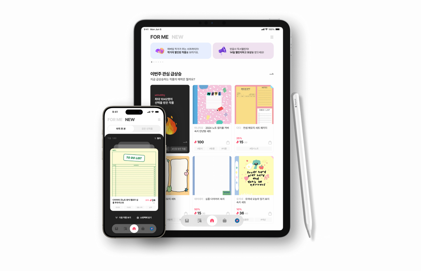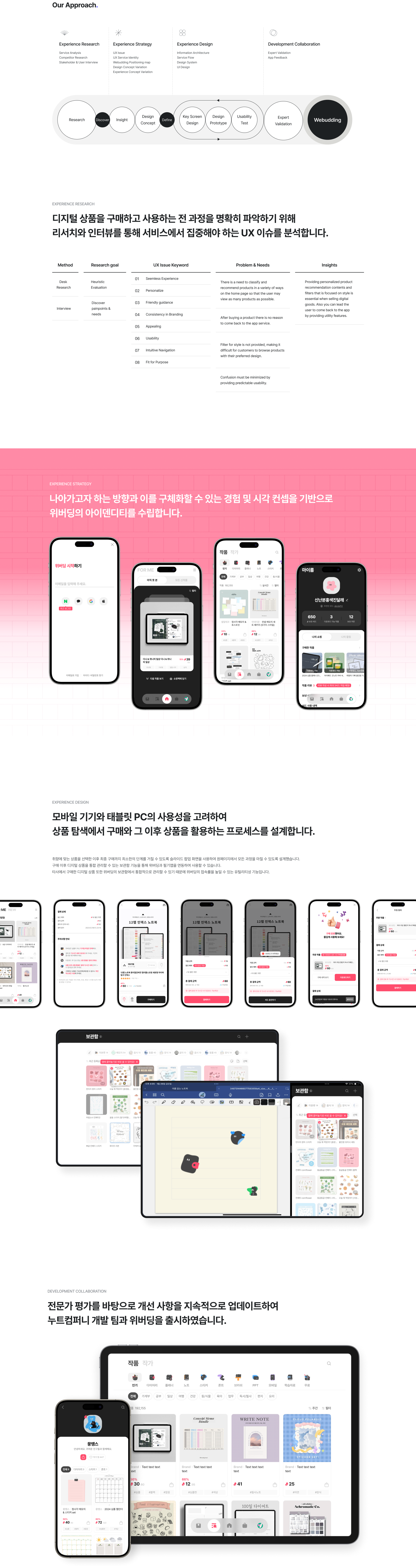 디지털 문구류를 탐색하고 구매하는 과정을 넘어 서비스를 사용하는 단계에서도 디지털 상품에 특화된 사용성을 제공하는 위버딩(Webudding)을 구축하였습니다.