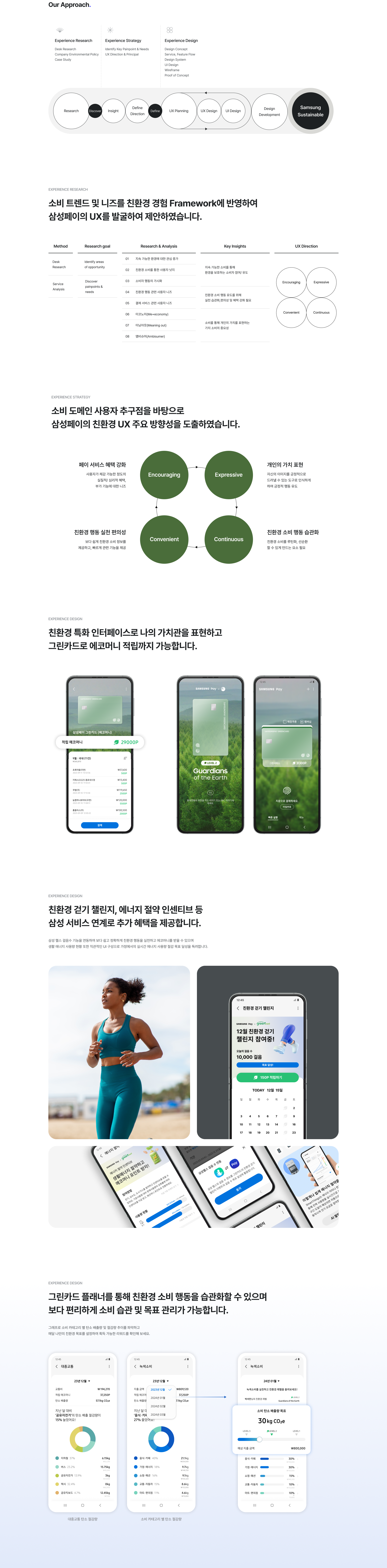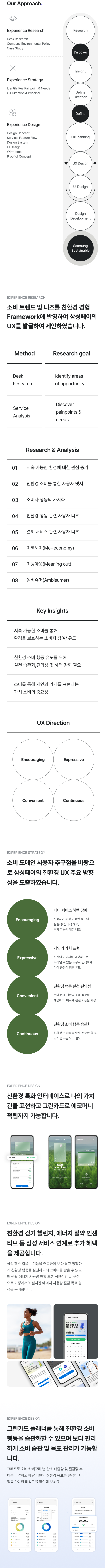 지속 가능한 소비를 통해 환경을 보호하는 소비자 참여 유도와 동기부여를 통한 목표 관리로 실천 습관화, 편의성 및 혜택을 강화하는 것이 중요합니다. 따라서 소비 경험 단계별 삼성페이 친환경 UX 경험 제공을 목표로 합니다.